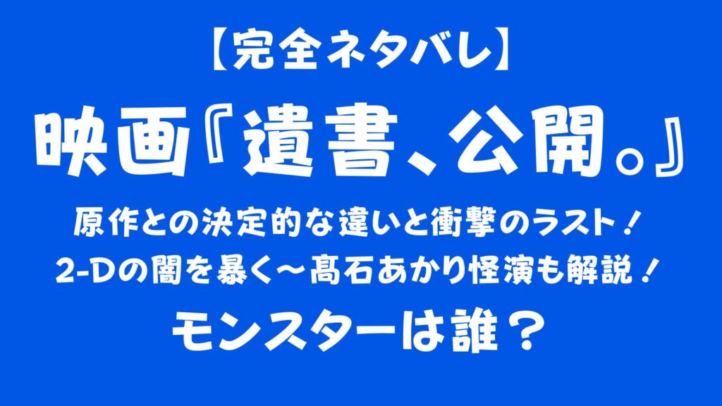 映画『遺書、公開。』の完全ネタバレ解説!原作との違いや犯人の正体、衝撃のラストを徹底考察。髙石あかりの怪演やクラスの闇、結末の意味まで詳細にまとめました。閲覧注意の全貌公開です。【期間限定0円】アニメ『正反対な君と僕』を見るなら今!原作無料&VOD見放題で「尊死」する人が続出中?