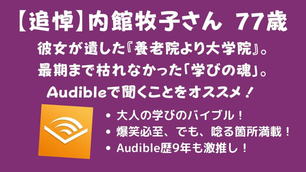 実写版ドラマ『ひらやすみ』(主演:岡山天音、共演:森七菜ほか)が12/4で放送終了。ロス者多発!そんななか東野幸治さんと佐久間プロデューサーがドラマを激賞して、また注目されています!そんな実写版をネタバレ込みで紹介します。【追悼】内館牧子さんが遺した『養老院より大学院』。最期まで枯れなかった「学びの魂」をAudibleで聞いてね!