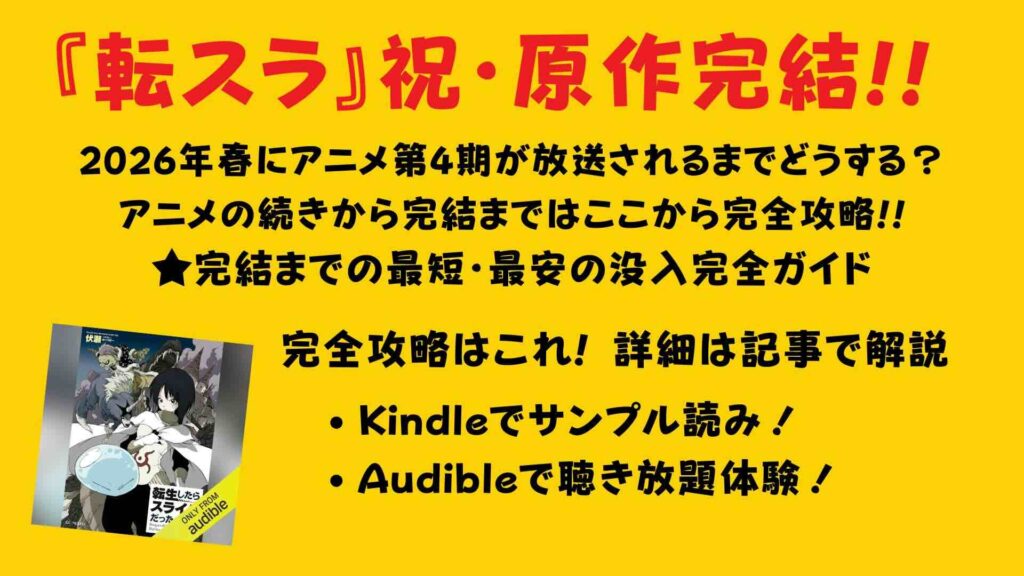 アニメ3期が終了した『転スラ』の物語、4期が始まるまでの間に、続きを最速・最安で知る方法を徹底解説。アニメ派が次に読むべき原作小説・漫画の巻数は?Amazonプライムで見放題、Audibleで聴き放題など、サブスクをフル活用して「魔国連邦」の深淵に触れる最強ルートを公開!2025年ベスト級。鈴木亮平×有村架純『花まんま』がAmazonプライムで見放題!原作未読でも号泣できる?